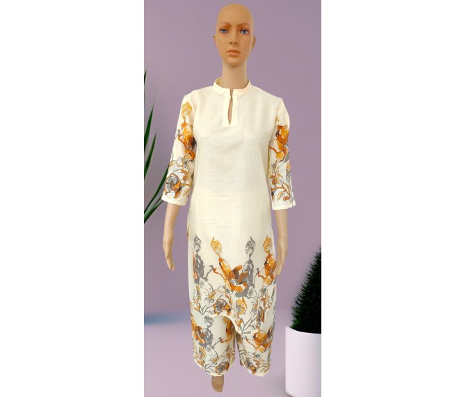 Experience comfort with a touch of elegance in this beige/cream loungewear set, beautifully accented with a delicate floral border. Made from soft, breathable fabric, it offers a relaxed fit that feels light and soothing on the skin. The subtle color palette and refined floral detailing create a graceful look, making it perfect for lounging at home, relaxing evenings, or comfortable sleepwear. A perfect blend of style, comfort, and everyday luxury.