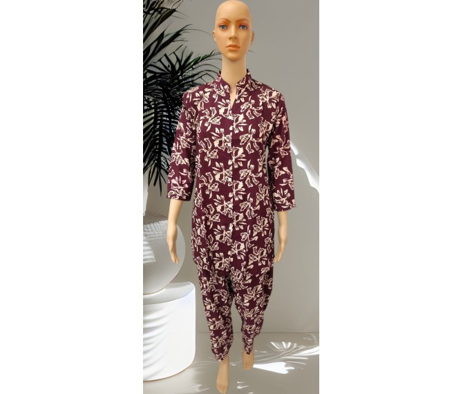 Unwind in comfort and style with this maroon all-over floral PJ set. Designed with a rich maroon base and charming floral prints throughout, it offers a cozy yet elegant look. Made from soft, breathable fabric, it ensures all-night comfort and ease of movement. Ideal for sleepwear or relaxed lounging at home, this PJ set blends timeless style with everyday comfort.