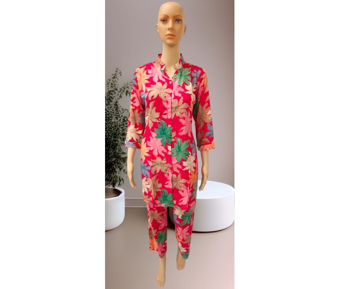 Add a pop of color to your nighttime wardrobe with this vibrant red tropical leaf print pyjama set. Made from soft, breathable fabric, it ensures all-night comfort and a relaxed fit. The bold red base paired with lively tropical leaf prints creates a fresh, stylish look. Perfect for comfortable sleep or lounging at home, this pyjama set blends eye-catching design with everyday ease and comfort.